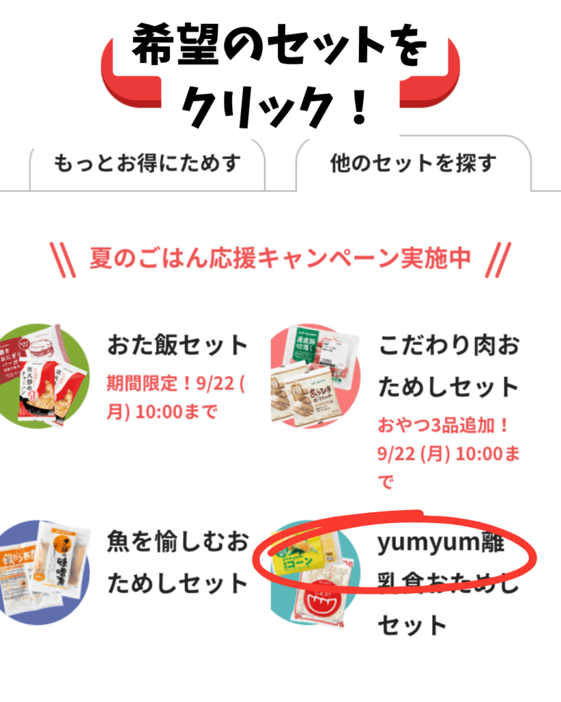 例:「yumyum離乳食」を希望する場合、表示されていない場合は右側のタブから「他のセットを探す」>「yumyum離乳食セット」のを選択します。