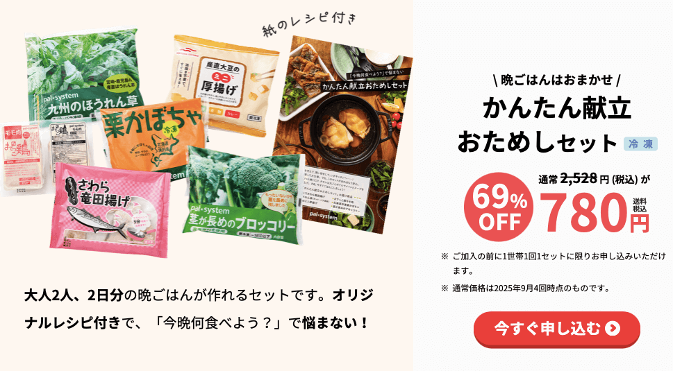 | セット | ![]() ![]() コープデリ お試しセット | ![]() ![]() パルシステム お試しセット |